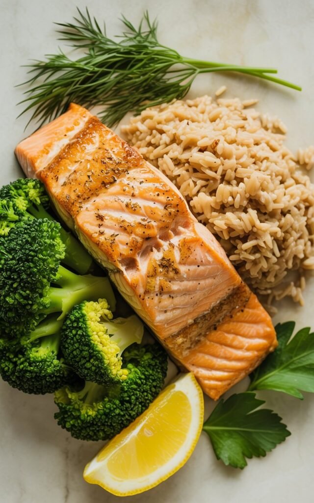 Dinner: Baked Salmon with Brown Rice and Broccoli (~30g Protein)