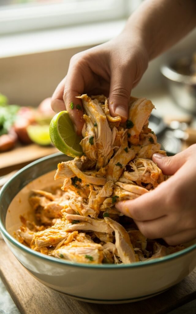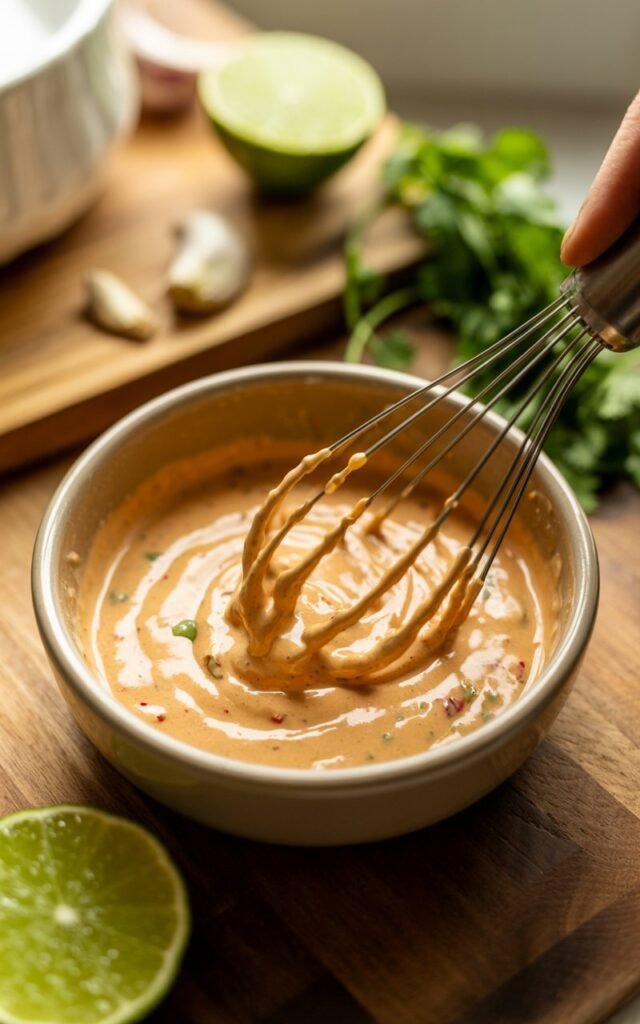 While the chicken is warming or resting, I mix the mayonnaise or Greek yogurt with chipotle, lime juice, honey, salt, and pepper.