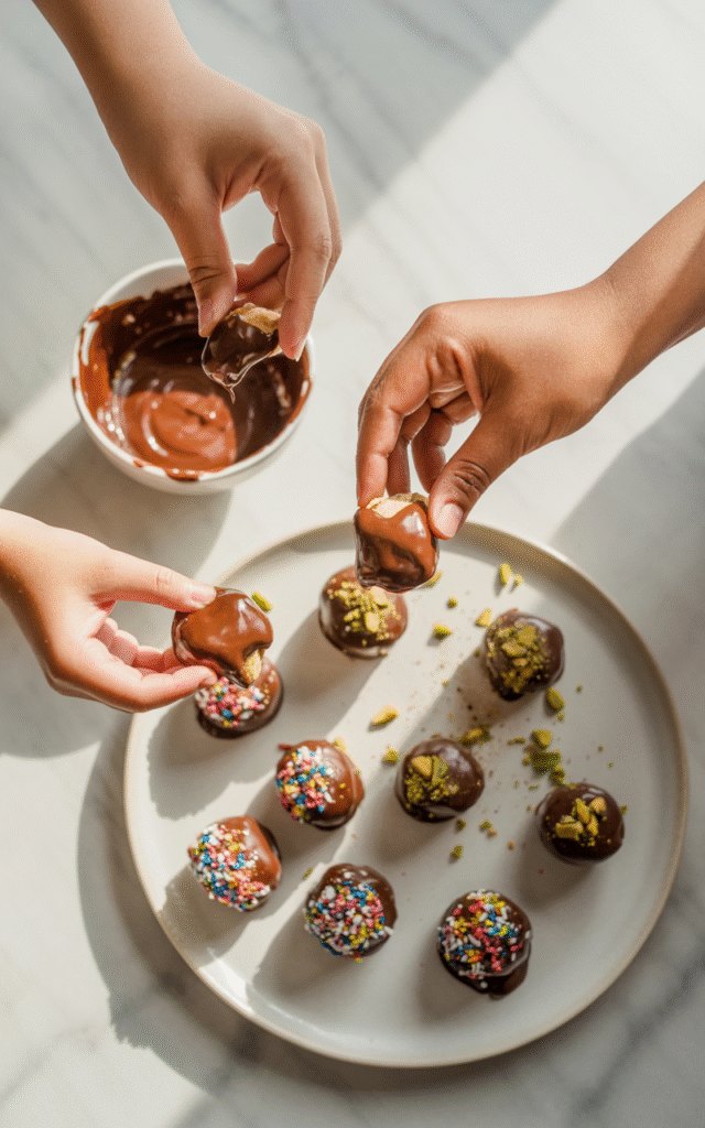 Pro tip: Work quickly. The chocolate sets fast on the frozen bites, but that’s part of the fun—it’s like a race against the chocolate!