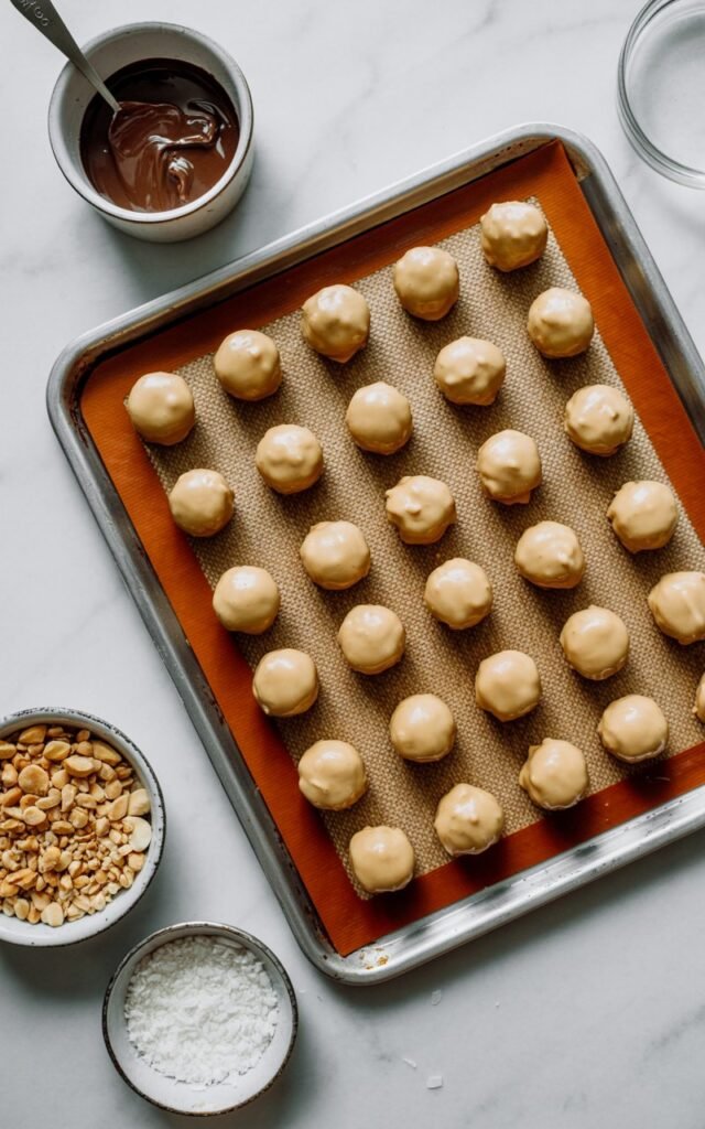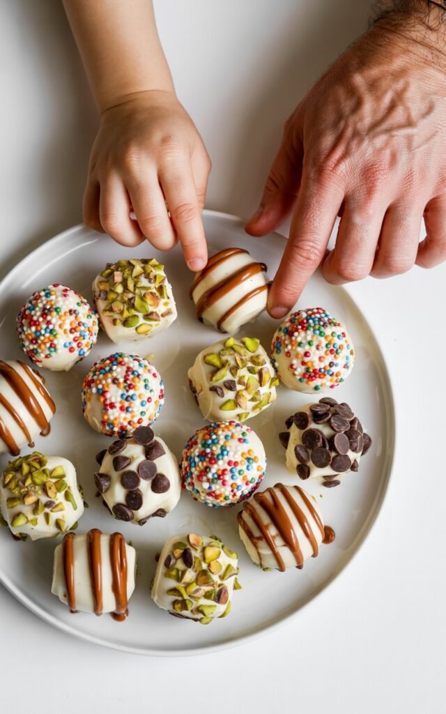 This is always the highlight: dipping the cold bites into warm chocolate, tapping off the excess, and decorating with crushed peanuts, coconut, or a sprinkle of chocolate chips.